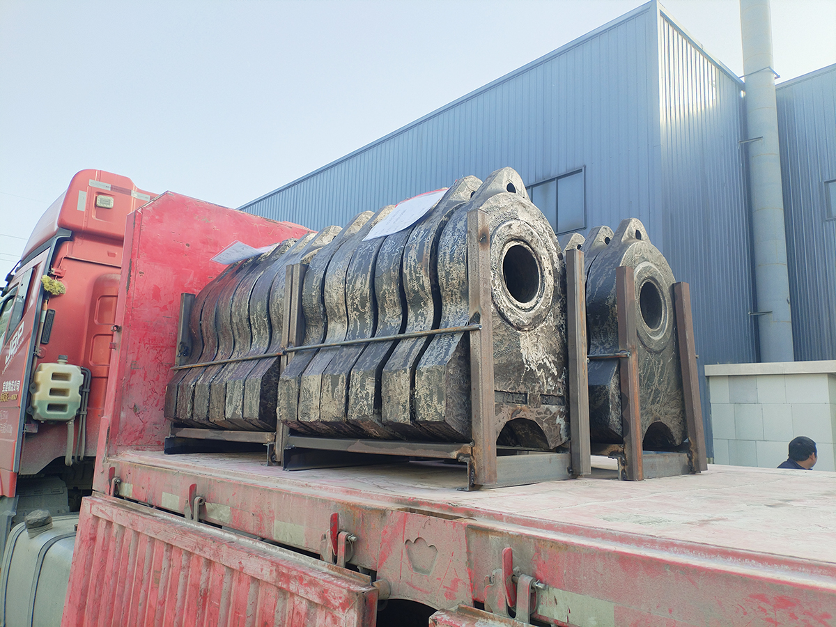 On Nov-27-2025, 50 pcs big hammer head of the hammer crusher loading in the truck, will export to European mining customer. This hammer head mateiral is high Manganese - Chormium alloy steel, hammer size is 900*700*120 mm, net weight is 370 kg per pcs.